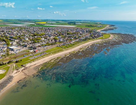 Famed for its Championship golf course, Carnoustie sits on the Angus coast between Dundee and Arbroath. Carnoustie bay is a sandy beach that sits between the sea and the golf course and is popular for windsurfing, canoeing, sailing and fishing.